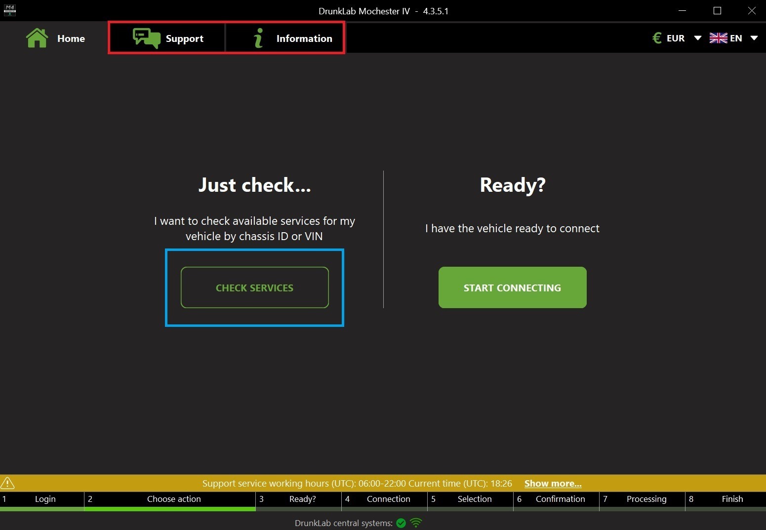 Please note the “Support” and “Information” tabs on this screen, highlighted in red. You can use the “Support” tab to contact our support team. The “Information” tab contains a detailed guide for the Mochester 4.