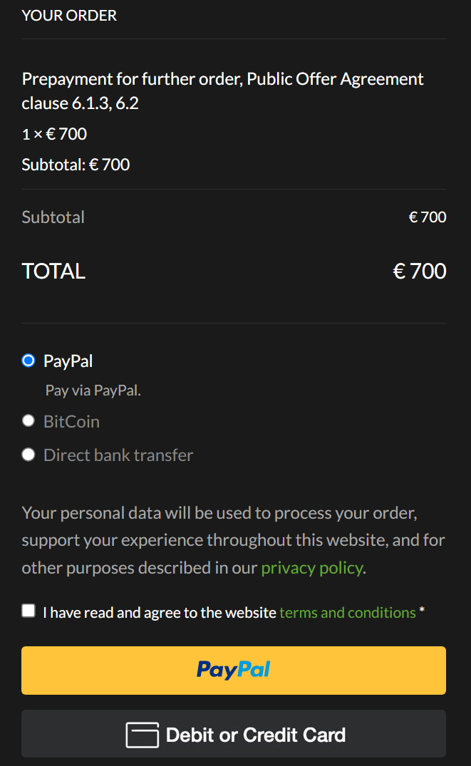 Check the “I have read and agree to the website terms and conditions*” box. The “*” sign means that this field is mandatory. Press “PayPal” and your payment will be processed by the corresponding system.