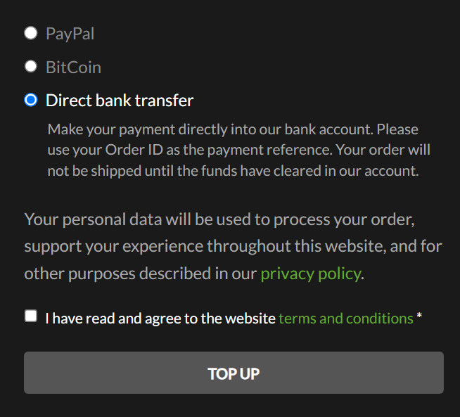 When selecting “Direct bank transfer” you are presented with this menu: