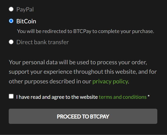 Press “Proceed to BTCPay” to continue with your payment. Your transaction will be handled by the corresponding provider.