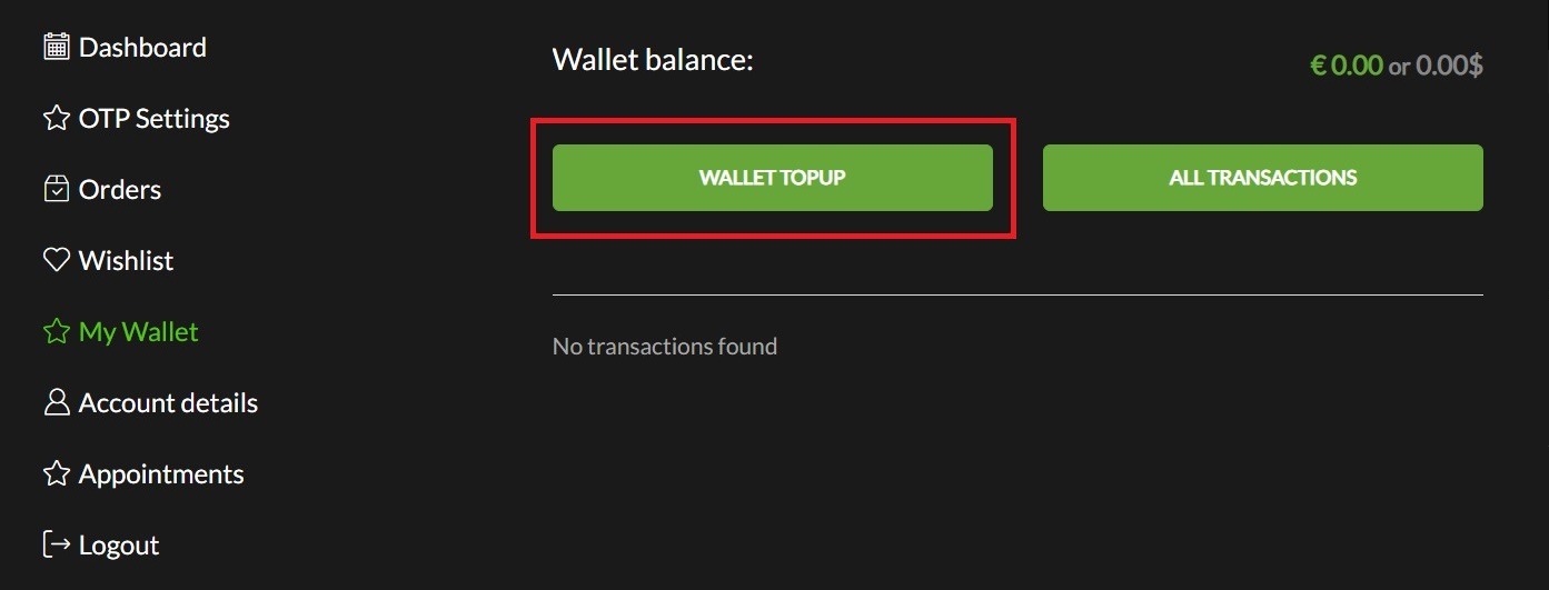 In the “My Wallet” section of your profile click on the “Wallet Topup” button.