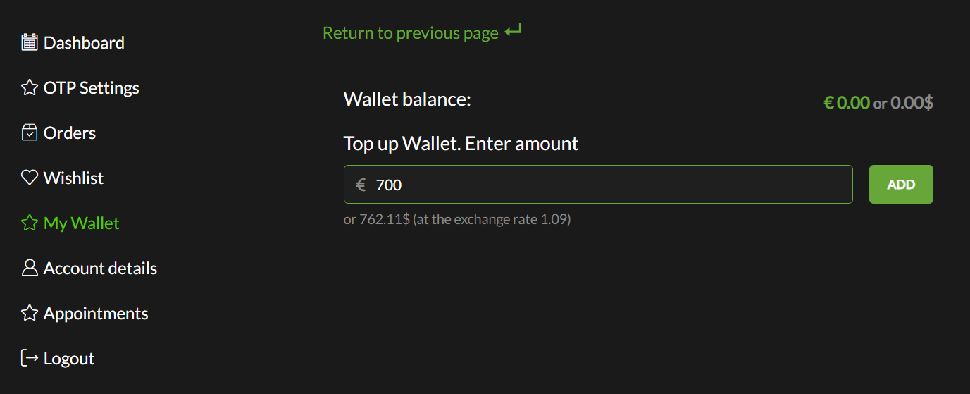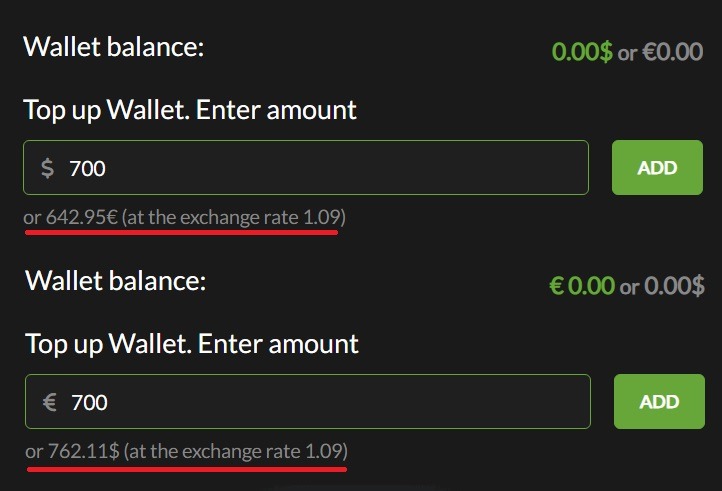 Enter the desired amount into the field. Note that you are topping up your wallet with the currency you have selected, with the converted amount shown below in gray.