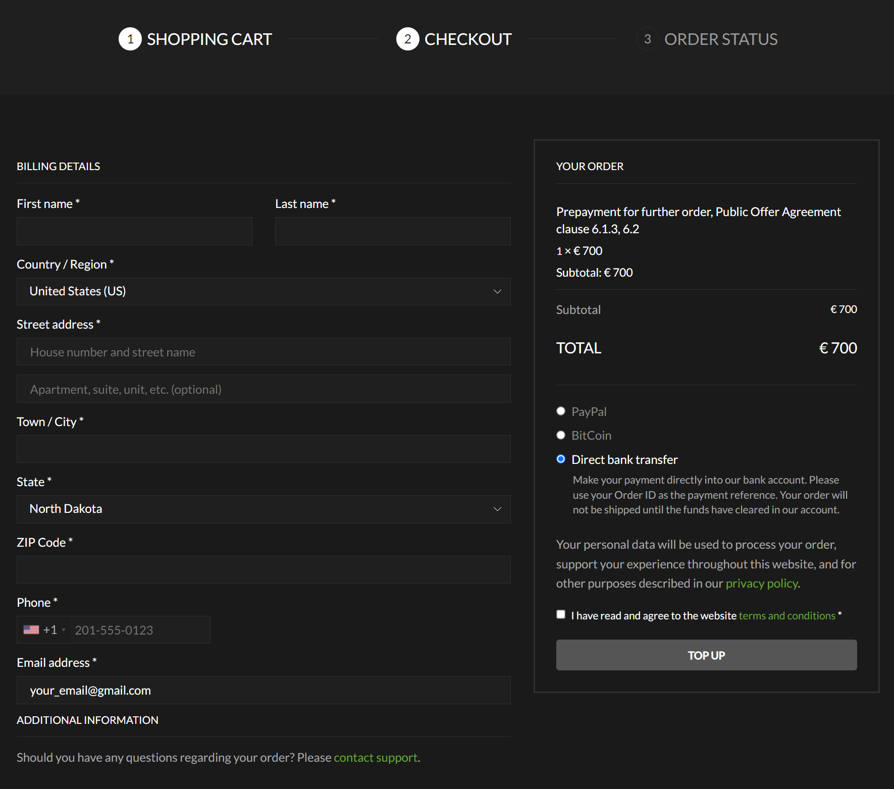 Enter your actual information into the corresponding fields. Fields marked with an asterisk(*) are mandatory. You can choose the payment option in the left portion of the screen, below the total of your order.