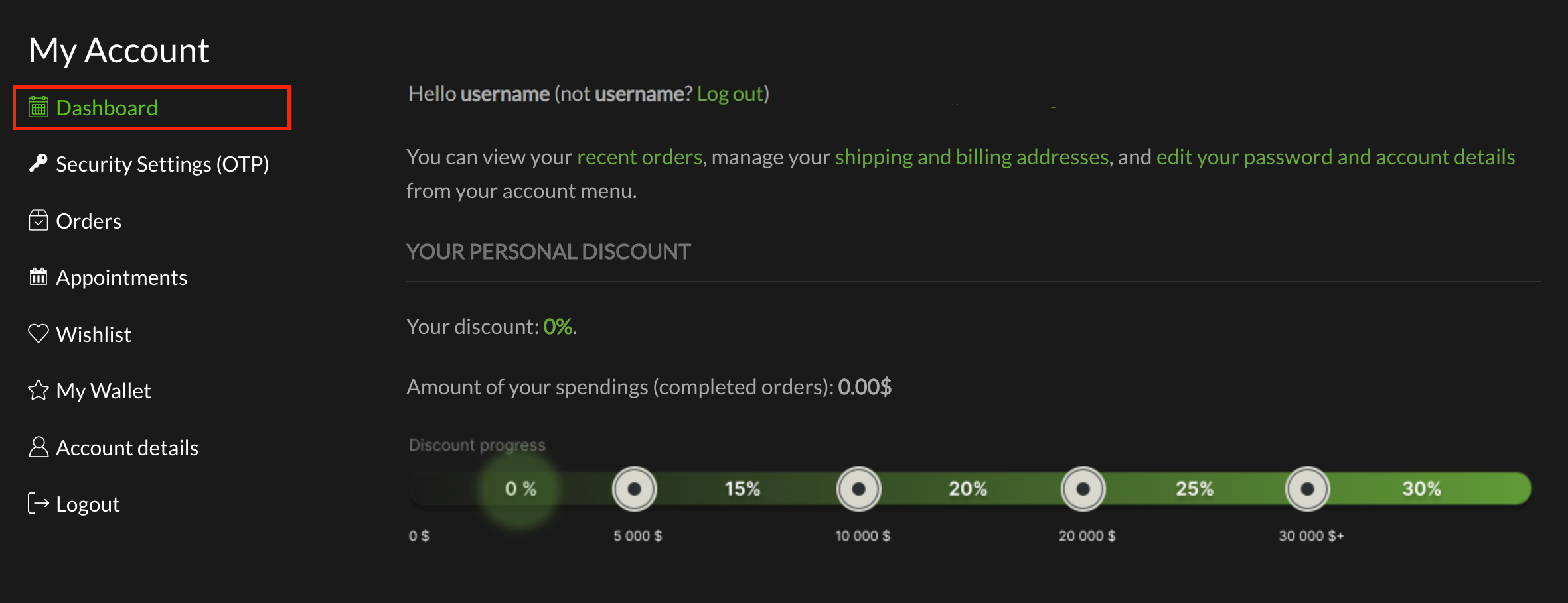You can view your account spending and available discounts in the “Dashboard” section of your wallet.