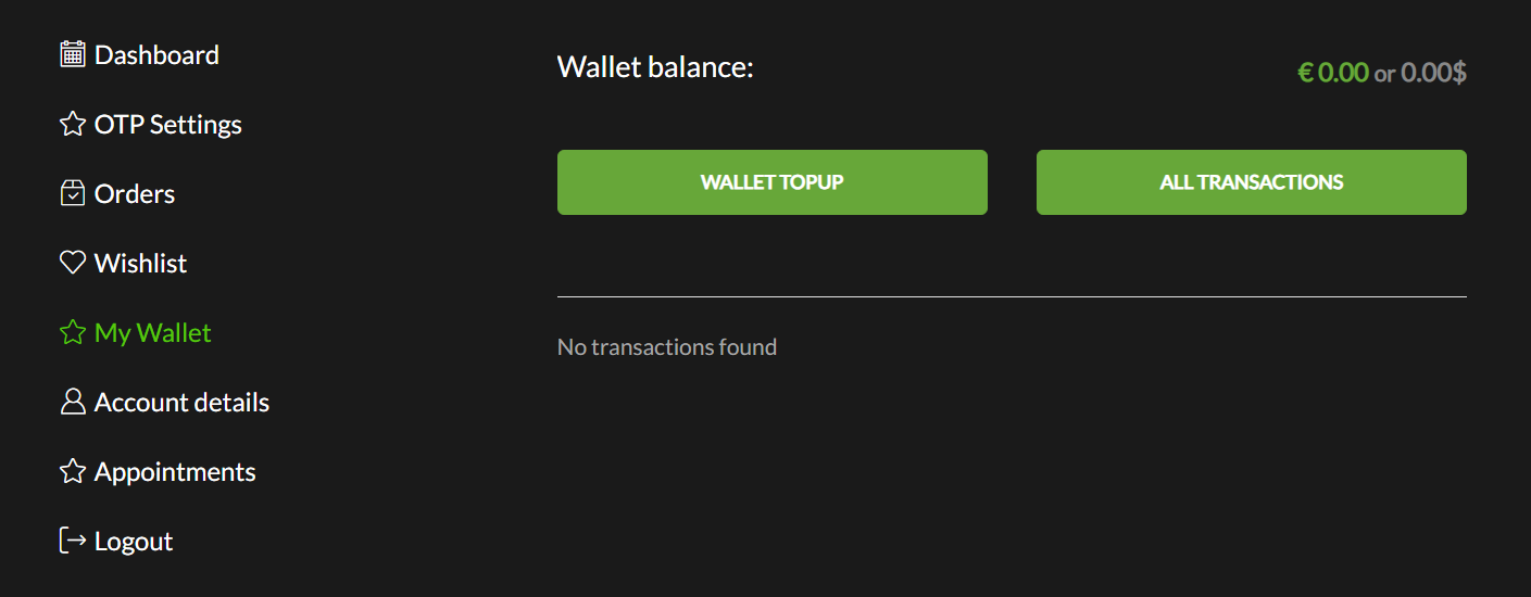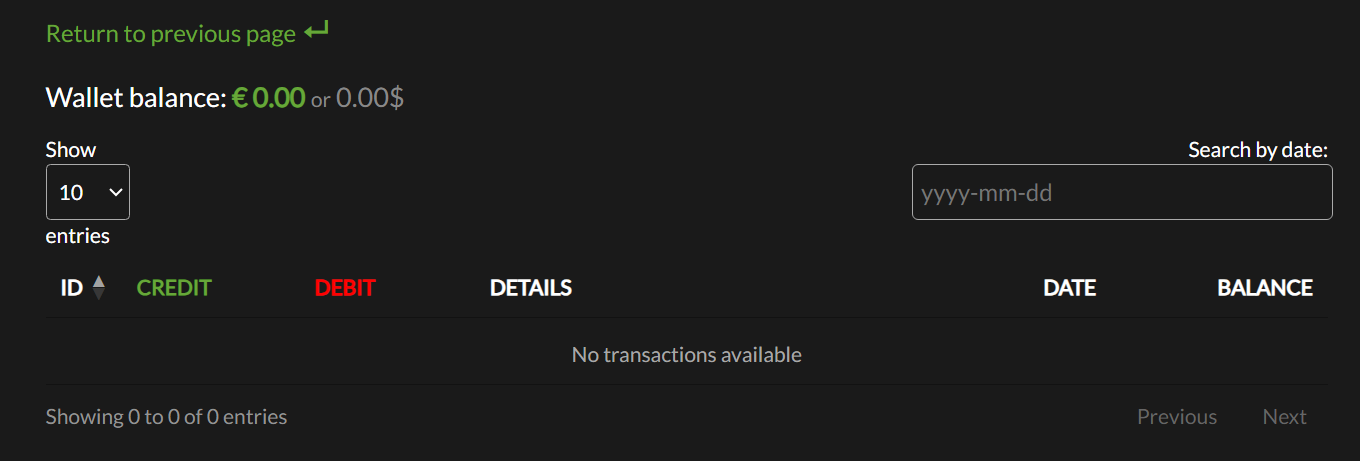 Upon entering the “My Wallet” section of your profile you will be presented with the following screen.